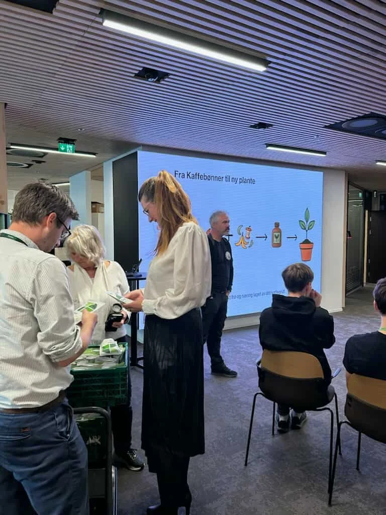 Vi har ledet prosjektet i tett samarbeid med Eviny og Wastec, og vært den pådrivende kraften bak utviklingen av en løsning som gir kaffegruten nytt liv. I stedet for å gå til avfall, blir gruten nå samlet inn og foredlet til næringsrik jord – ferdig pakket med frø som bare venter på å spire.